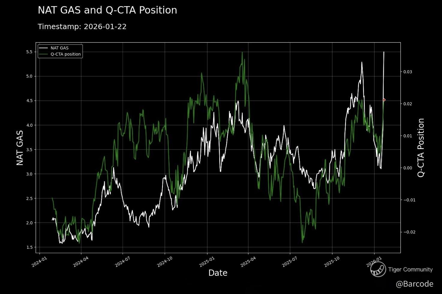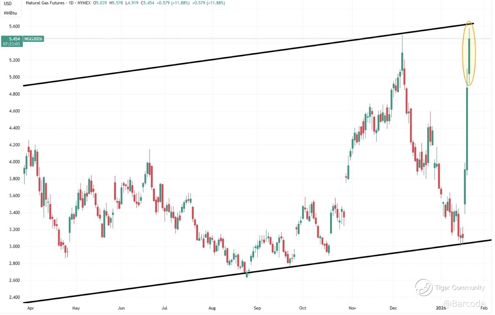 Commodities delivered mixed signals. Natural gas futures /NG extended volatility, reversing sharply lower after intraday highs tied to weather forecasts and earlier +10% upside. Price is now testing a long term resistance zone that has capped rallies since late 2023. I believe frigid weather remains the dominant catalyst, but blow off top risk is elevated if momentum fades. Gold benefited from renewed safe haven interest after Goldman Sachs raised its year end target to $5,400 per ounce, citing skewed upside risks from policy uncertainty, even as broader volatility continued to compress.