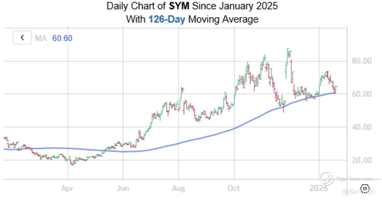 🟢 $SYM Symbotic is rebounding from the $60 zone and approaching a historically constructive 126 day moving average. Schaeffer’s signals show two similar setups over the past decade, both followed by positive 30 day forward returns averaging about +6.6%. Short interest sits near 12.9% of float with roughly five days to cover, increasing the probability of a tactical short squeeze if momentum builds.