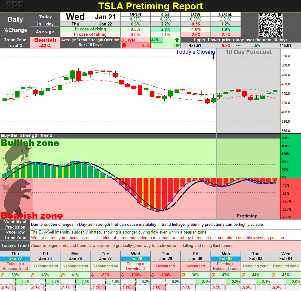 Over the next 10 days, TSLA is expected to remain in a Bearish trend zone, though with increased volatility and frequent countertrend moves.