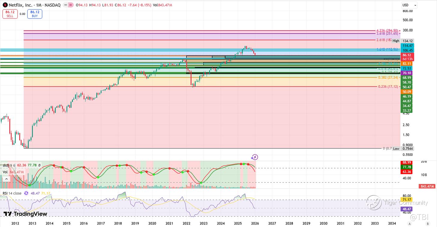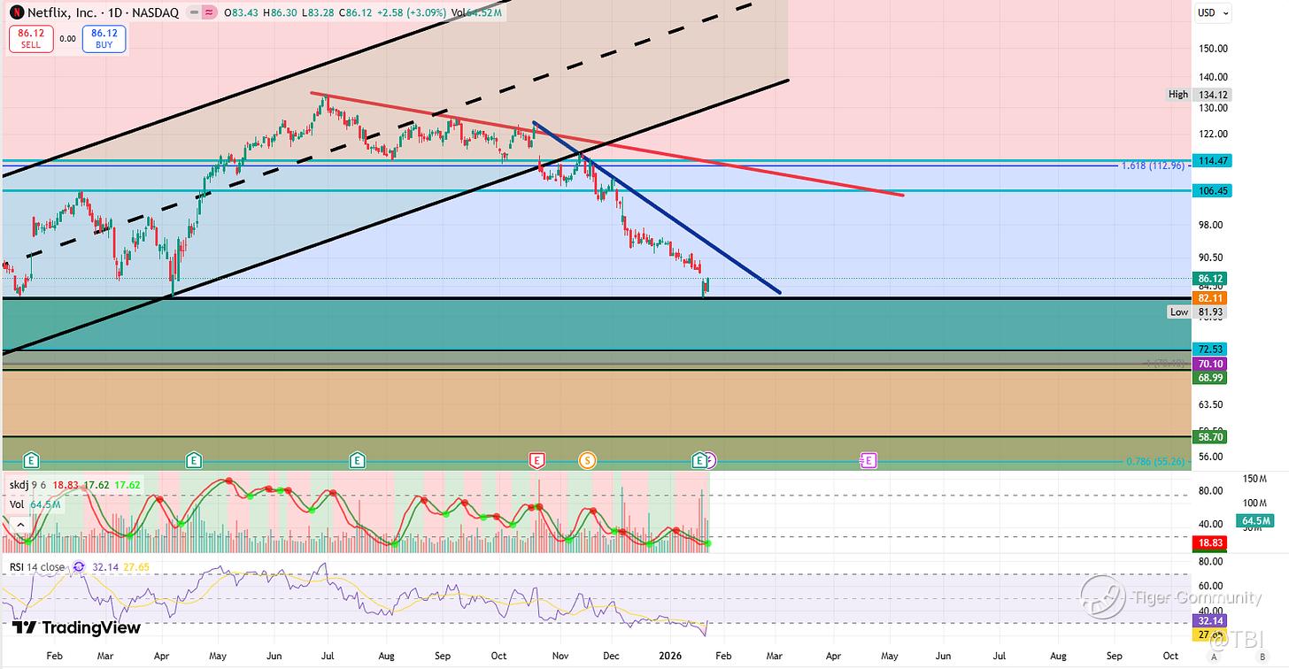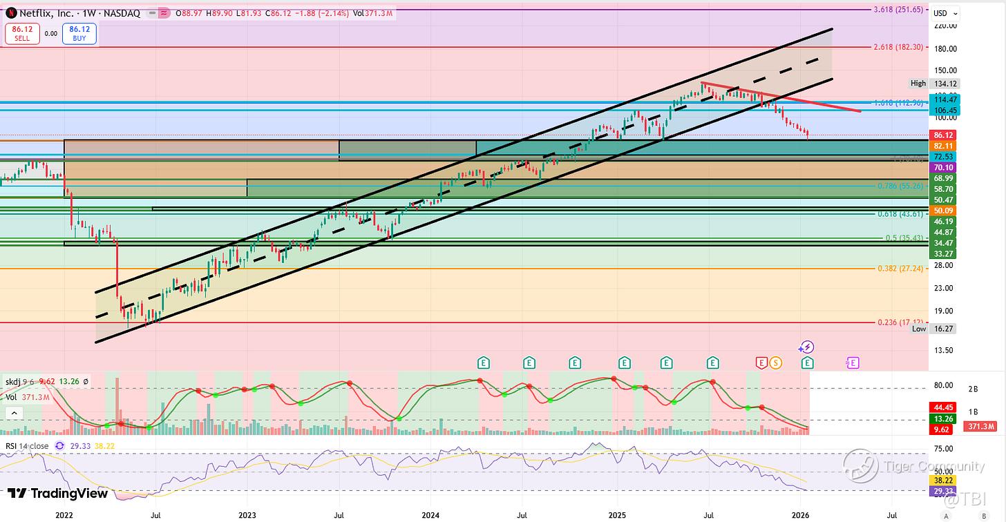 Currently, it should be headed back into the dark-blue resistance trendline. Breakout here, and NFLX should retrace back into the red resistance trendline + 106.45 quarterly resistance.