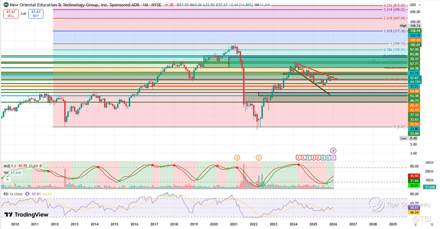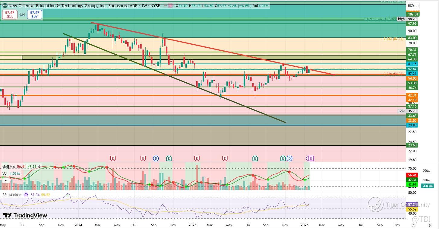 EDU is currently consolidating in a descending broadening wedge pattern. It’s also trading above the 54.33 Fib level that sees confluence with 53-54 higher timeframe levels (yearly + half-yearly).