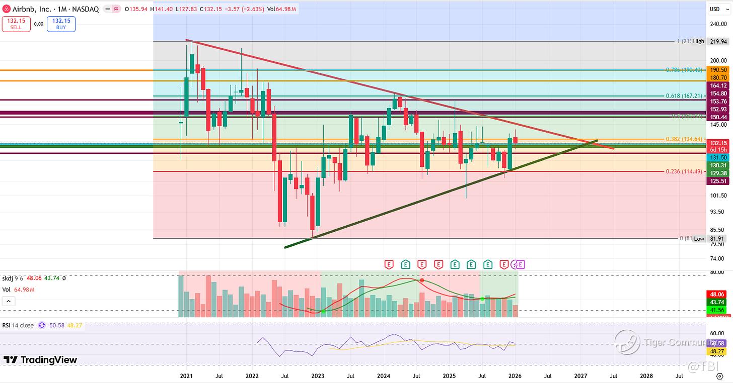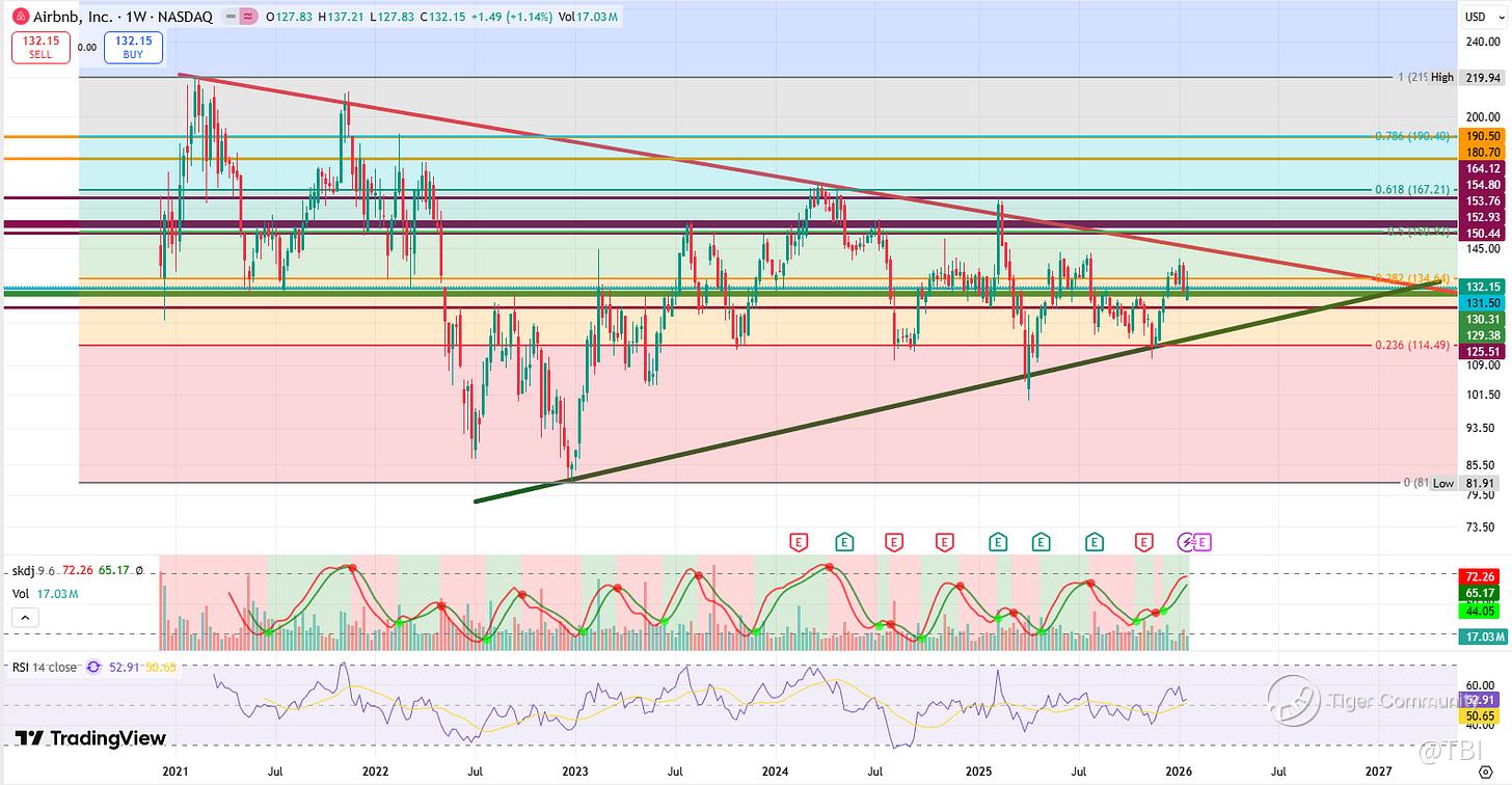 ABNB has been compressing for several years in this lower highs and higher lows pattern. The key trigger for upside is the 134.64 Fib, which should see a move back into the resistance trendline.