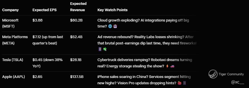 These numbers aren't just stats—they're potential market movers! If Microsoft nails cloud dominance with Azure's AI edge, it could reverse that underwhelming yearly performance. Meta's under the microscope after their last selloff fiasco; anything short of stellar ad metrics or metaverse wins might trigger more pain. 😬 Tesla's grappling with profit dips, but Elon Musk's wild card energy could unleash surprises in autonomy or batteries. And Apple? Strong iPhone demand and services could finally outpace the market, proving the ecosystem's unbreakable.