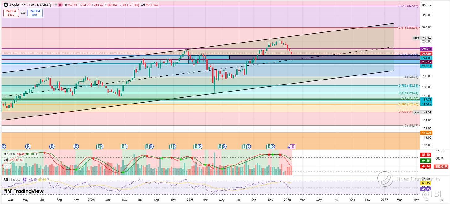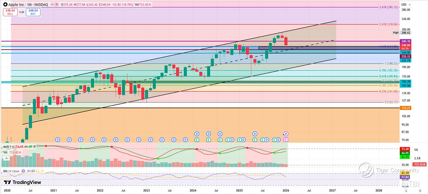 Should AAPL break and close below 244, it's likely to retrace further into the monthly imbalance at 235.12. Given that AAPL rejected channel resistance, note that there remains the possibility of downside should AAPL break below the quarterly/monthly imbalances it has formed over the past few months, as indicated on the chart.