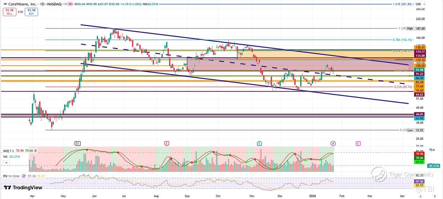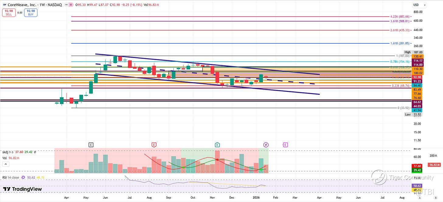 CRWV rejected off the 100.02 weekly imbalance fill and closed the week just above the 92.15 Fib level as well as the 91.22 monthly resistance.