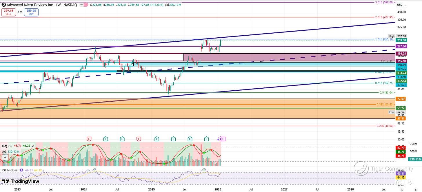 AMD rejected off the 265.10 Fib extension again. Should this level continue to act as resistance, it's likely that AMD retraces back into the prior high at 227.30.