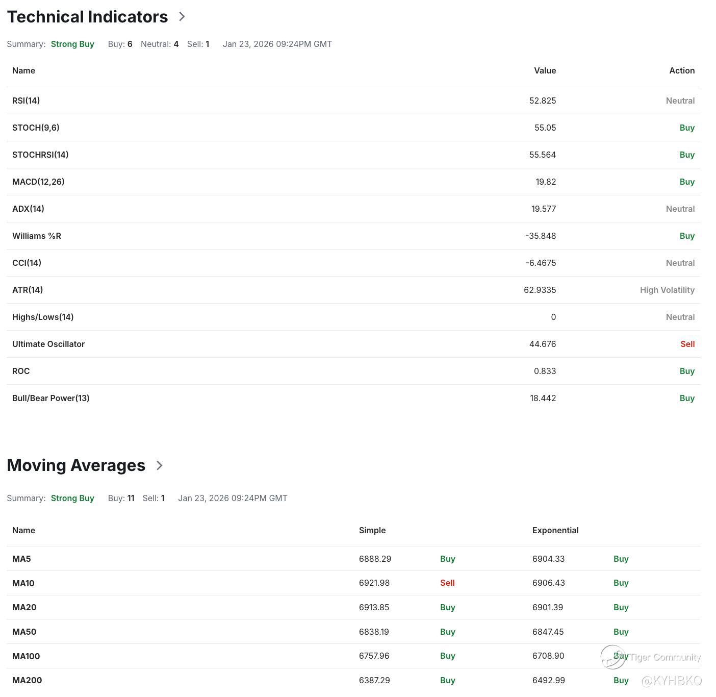 Based on the daily interval, 17 indicators display a “Buy” rating, while 2 display a “Sell” rating. This leads to a “Strong Buy” rating based on the daily interval.