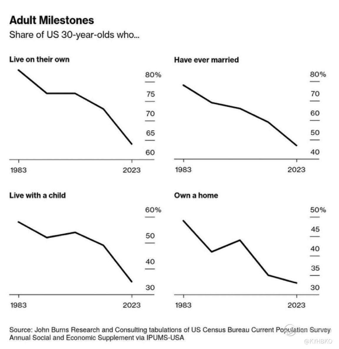 This is one of the most “unaffordable” times for Americans. This can be seen in the chart above, coming to living on your own, marriage, having kids and home ownership.