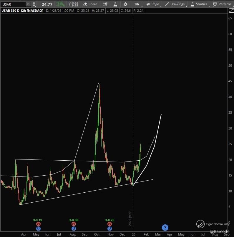 This implies a measured re-extension toward prior cycle highs if momentum sustains. $USAR is repeating its historical expansion cycle, except now it is backed by government capital rather than speculative retail flows.