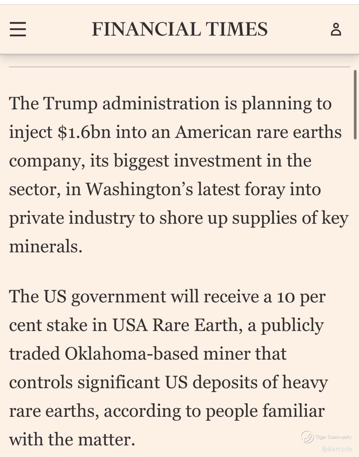 The Trump Administration is committing $1.6B to USA Rare Earth Inc ($USAR) for a 10% equity stake, per FT. The structure includes the acquisition of approximately 16.1M shares at $17.17 each, alongside warrants for an additional 17.6M shares. This represents the largest US government allocation to the rare earth domain to date, anchoring domestic supply chains, strategic autonomy, and industrial sovereignty. $USAR closed Friday up +9% at approximately $24.77 and is now +46% over the last 5 days. Trump wants more US rare earths, and the market is front-running executive policy direction. This is the kind of tape where you buy what the president tells you to buy.