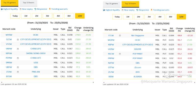 🔝Consequently, OCBC and UOB call warrants have emerged amongst the top warrant gainers over the last 12 weeks with returns of +278.9% and 94.6% while a OCBC put warrant which fell 96.7% over this period, is the second worst performing warrant over the past 12 weeks