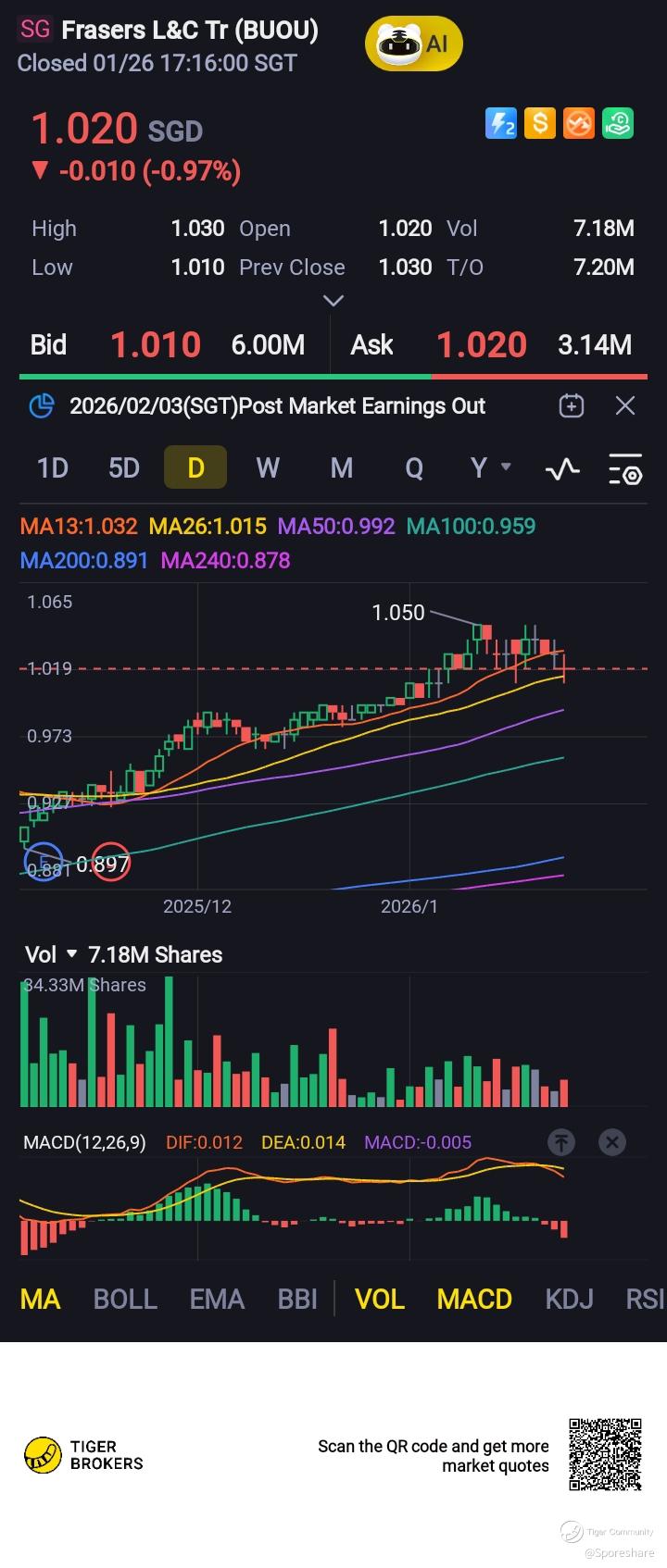 Frasers L&C Tr - Awesome, finally 1.01 is here. Likely to continue to trend higher!