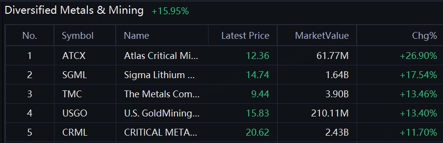 The best-performing concepts is Precious Metals & Minerals Concept. Considering the different perceptions of the stock, this time TigerPicks chose $Atlas Critical Minerals Corporation(ATCX)$ $Sigma Lithium Corporation(SGML)$ $The Metals Company(TMC)$ $U.S. GoldMining Inc.(USGO)$ $CRITICAL METALS CORPORATION(CRML)$ to have a fundamental highlight to help users understand it better.