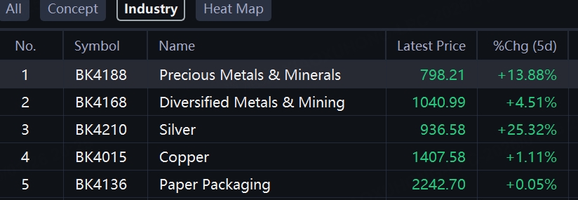 In the past five trading days, Precious Metals & Minerals stocks has risen average by 13.88%.