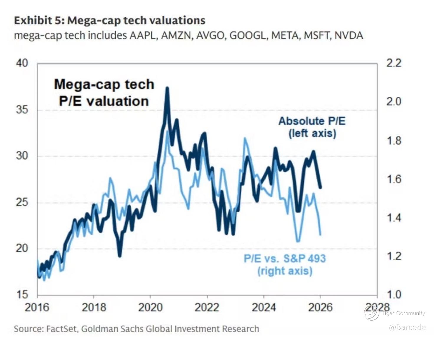 I am watching mega-cap tech reprice from premium to proof, and the tape is confirming a regime transition, not a breakdown, across $AAPL, $AMZN, $AVGO, $GOOGL, $META, $MSFT, and $NVDA. Goldman Sachs highlights mega-cap tech at ~27x forward P/E, in the 59th percentile over the past decade. The 31% valuation premium versus the broader $SPX ranks in only the 24th percentile over 10 years, signalling that relative excess has already compressed meaningfully.