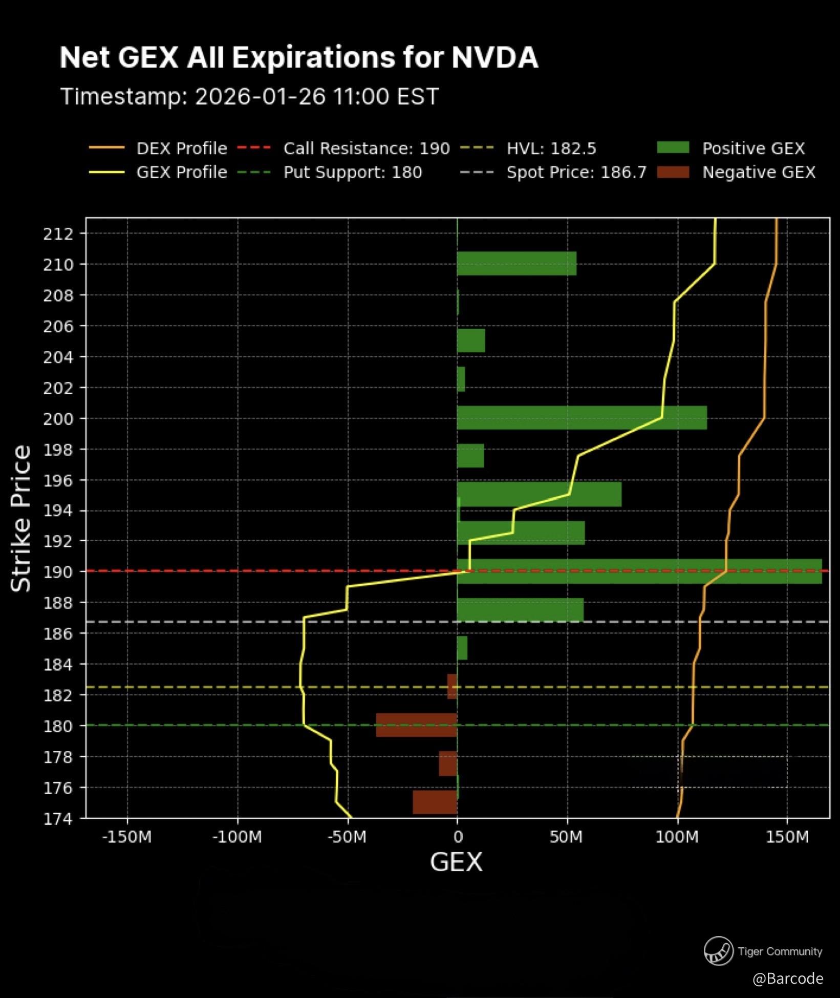• Call-side gamma resistance clusters near ~$192–$195, while put-side support sits near ~$180, compressing spot price mid-range