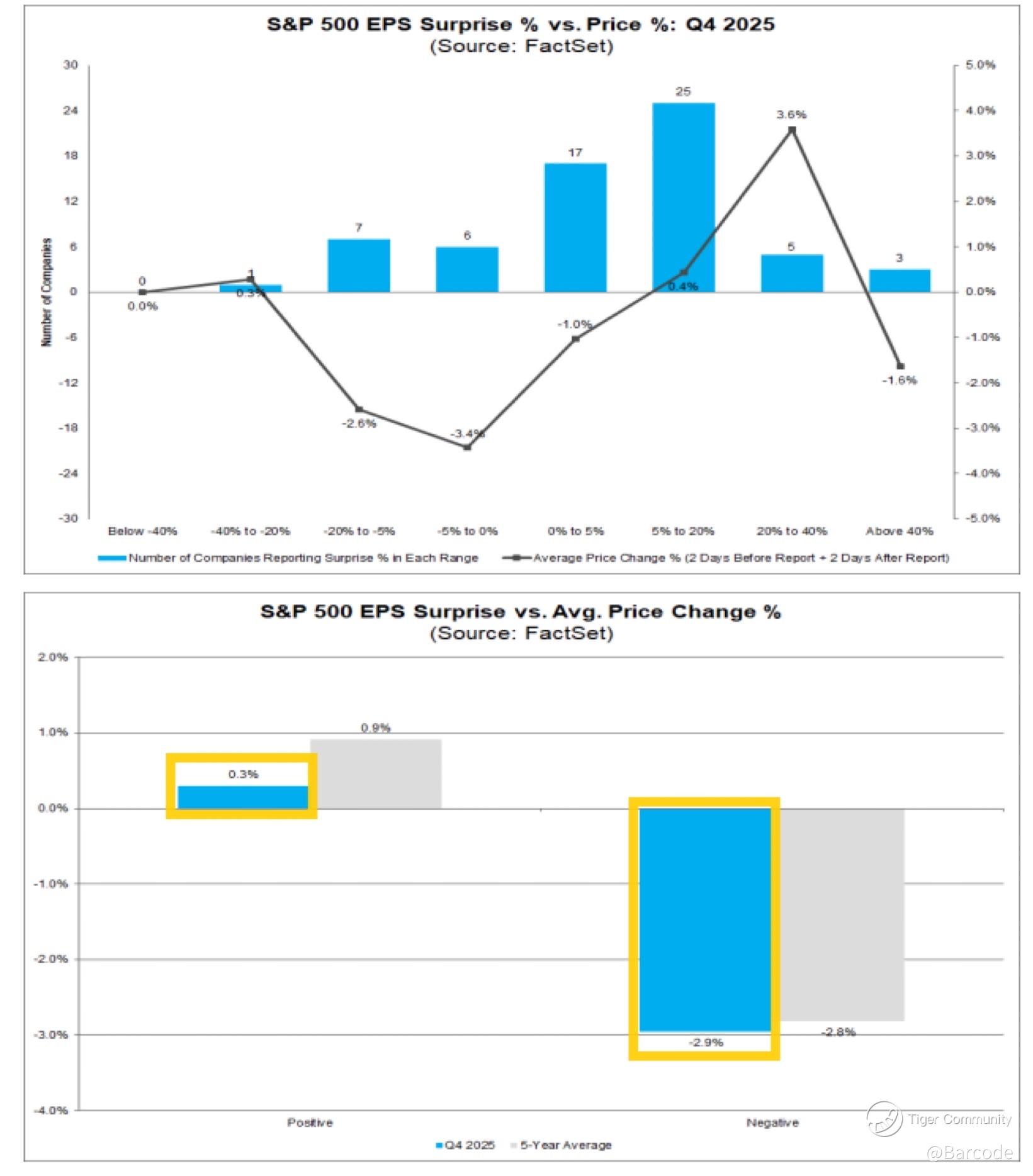 • Misses remain punished, though downside reaction has eased to ~-2.9%, now roughly in line with the five-year average of -2.8%
