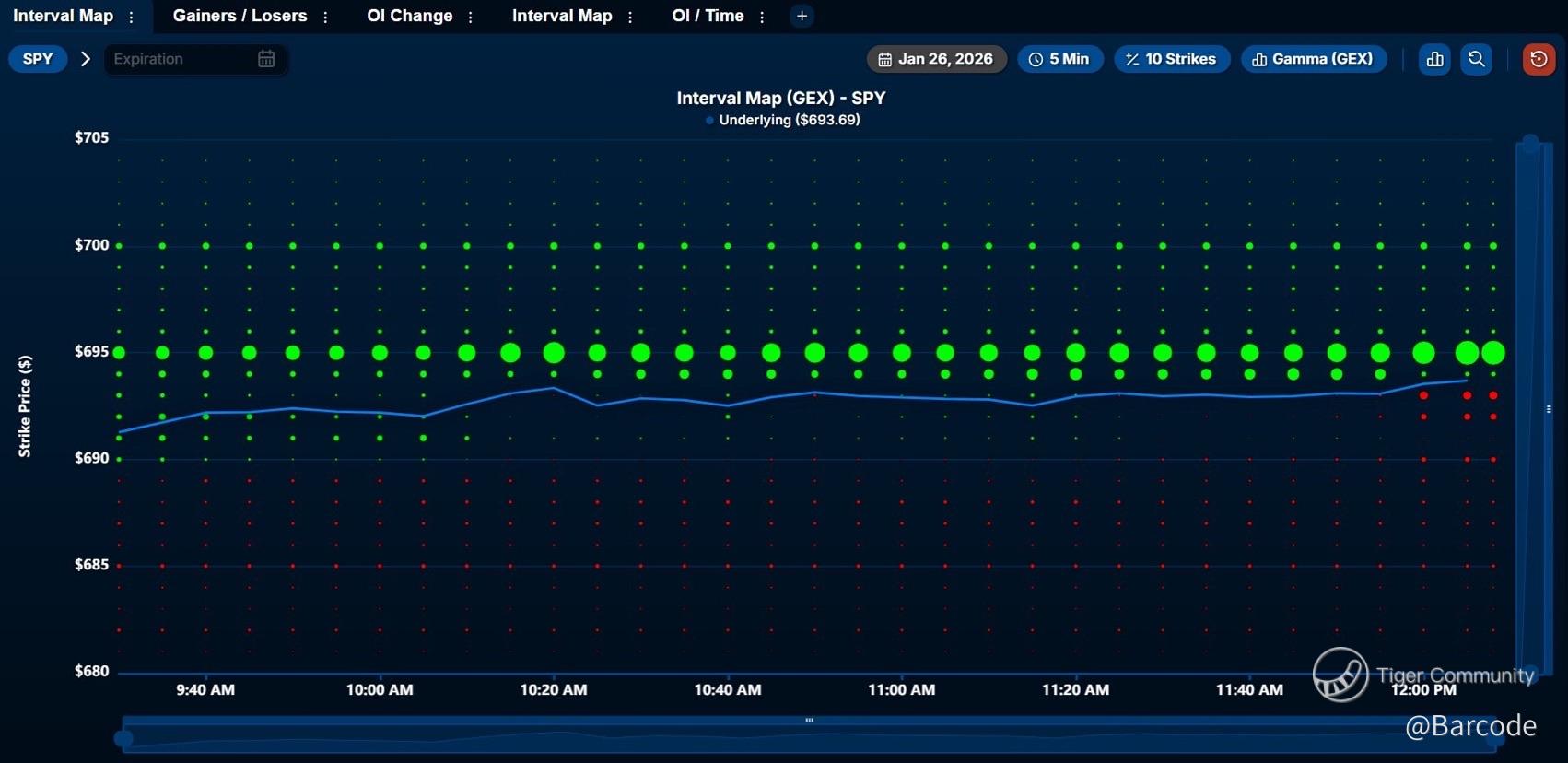 🧲 Gamma map shows heavy positive GEX clustered $695 to $700, anchoring support, feeding pin risk, and defending levels.