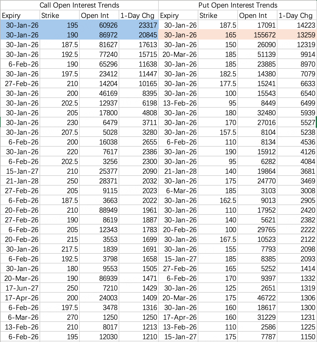 The expected trading range for this week is between 185 and 195. However, bearish order flow indicates some are still betting on a flash crash. Considering the pattern of post-earnings declines in the first two weeks of the season, a pullback to 180 cannot be entirely ruled out.