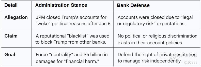 The 22 Jan 2026 lawsuit against JPMorgan and Jamie Dimon, represents a personal escalation of the administration’s "anti-debanking" platform.