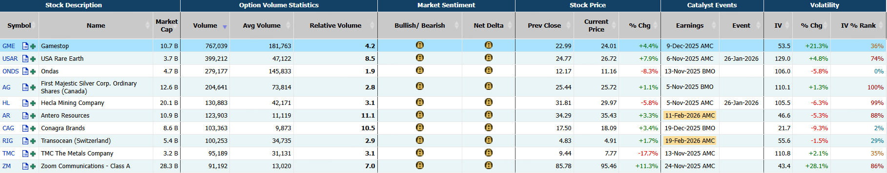 This report shows stocks with the highest volume of bullish and bearish activity by option delta volume, which converts option volume to an equivalent stock volume (bought or sold).