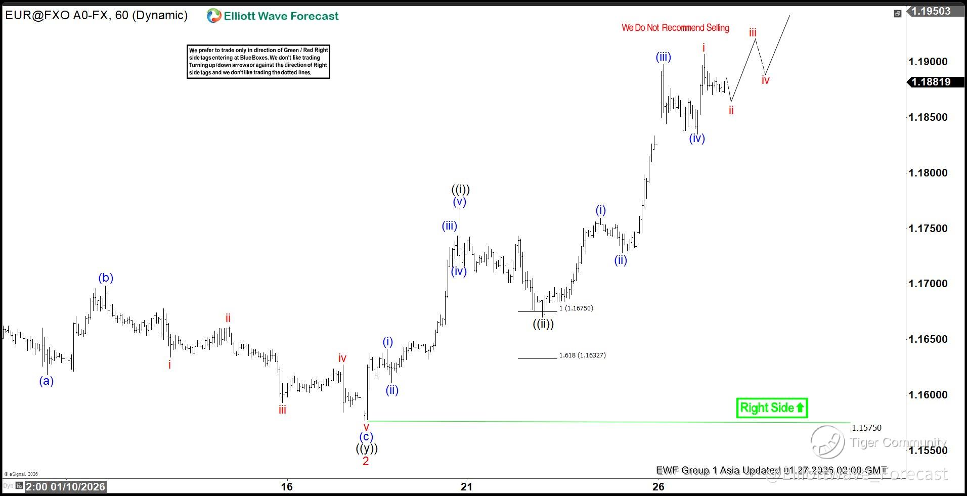 From the peak of wave 1, wave ((w)) ended at 1.1659, followed by a corrective rally in wave ((x)) that terminated at 1.1742. The final leg of the correction, wave ((y)), pushed lower and ended at 1.1575. This completed wave 2 at a higher degree and set the stage for renewed upside momentum. Since then, the pair has resumed higher in wave 3, confirming the impulsive structure.