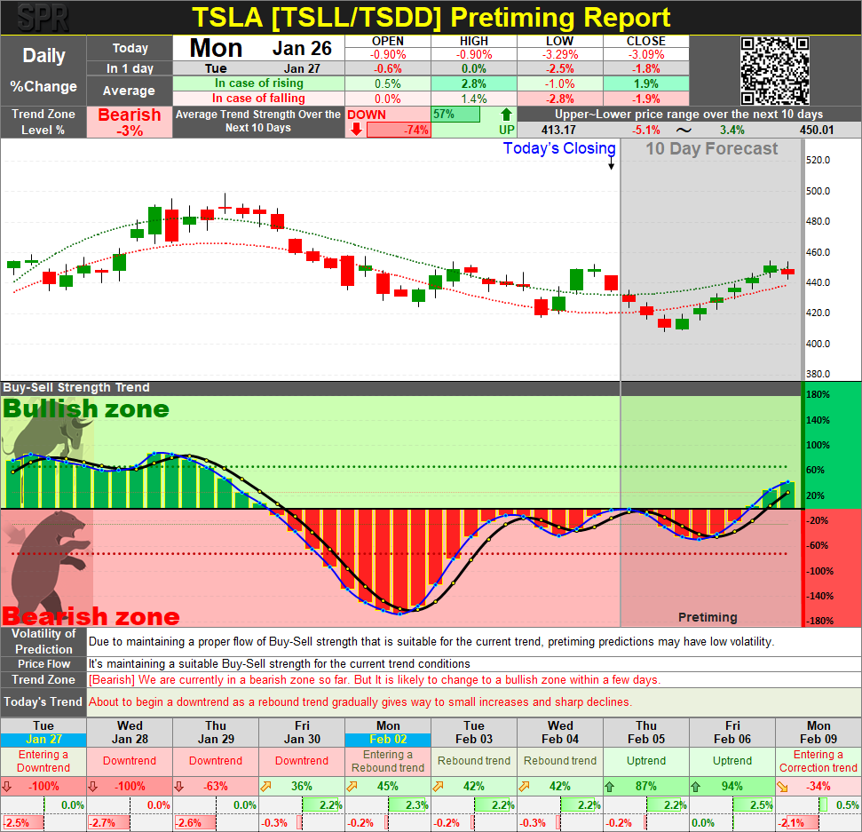 On Jan 26, 2026, TSLA closed at 435.2, declining -3.09%, confirming renewed downside pressure following a short-lived rebound attempt. Price action on the day reflected a failure to sustain upward momentum, with sellers regaining control as intraday rebounds were met with strong selling responses.