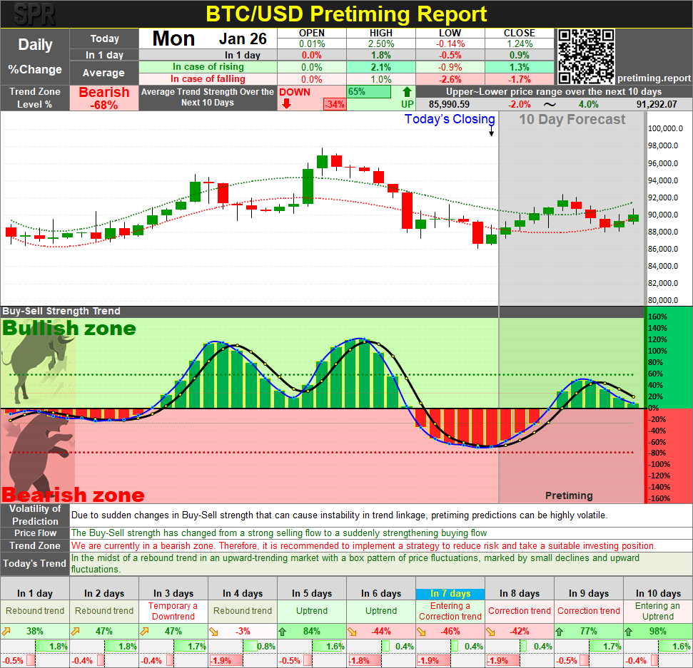 On January 26, 2026, BTC/USD closed at 87,745.5, posting a +1.24% daily gain. Despite the positive close, price action remains technically constrained within a Bearish trend zone, reflecting a rebound-driven move rather than a confirmed trend reversal. Investor sentiment improved modestly during the session as buying pressure strengthened abruptly, but this occurred against the backdrop of a broader bearish structure.