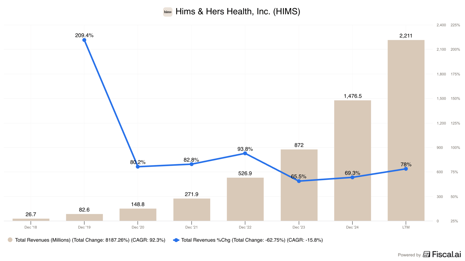 I present to you…Hims & Hers, which has a compound annual growth rate of 92% since 2018 and a 78% growth rate over the past year.