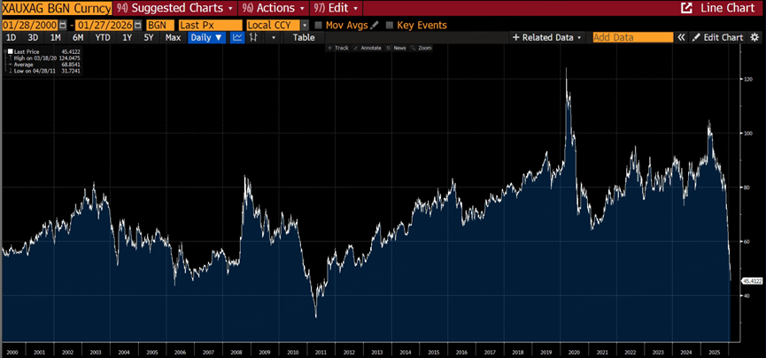 From the gold-silver ratio perspective, the current level stands at 45.3%, near multi-year lows, though it has yet to surpass the record low of 32 times seen in 2011: