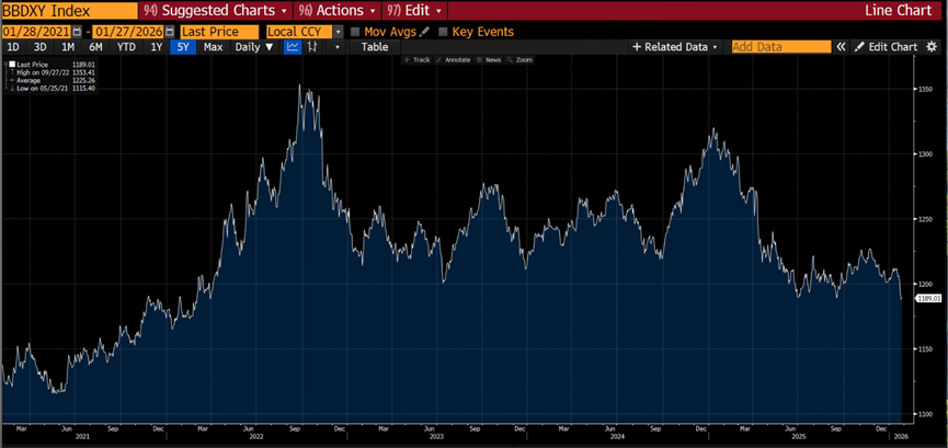 These repeated sanctions have severely disrupted global order, causing the U.S. dollar to depreciate. The Bloomberg Dollar Index has fallen to its lowest level in five years: