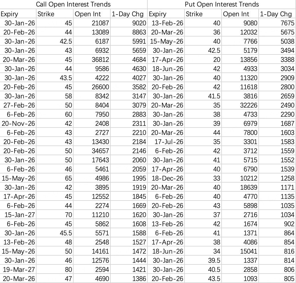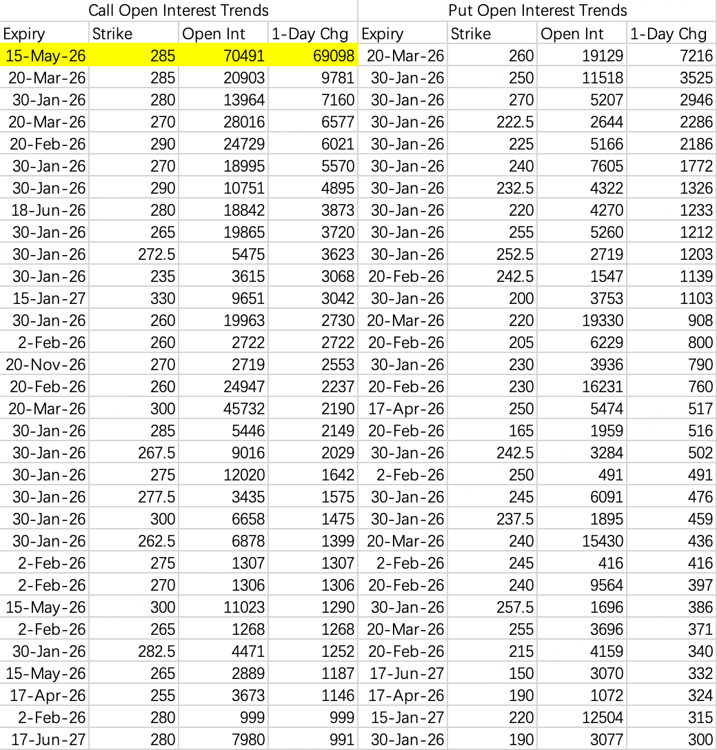 Although I believe Apple's performance this year may still be weighed down by high memory prices, this doesn't prevent the market and large investors from perceiving a potential bottom. With earnings this week, selling the 250 put is an option: $AAPL 20260130 250.0 PUT$ .