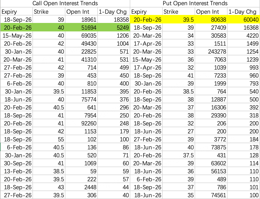 However, on Monday, another large bearish order emerged: $FXI 20260220 39.5 PUT$ , with 60,000 contracts opened.