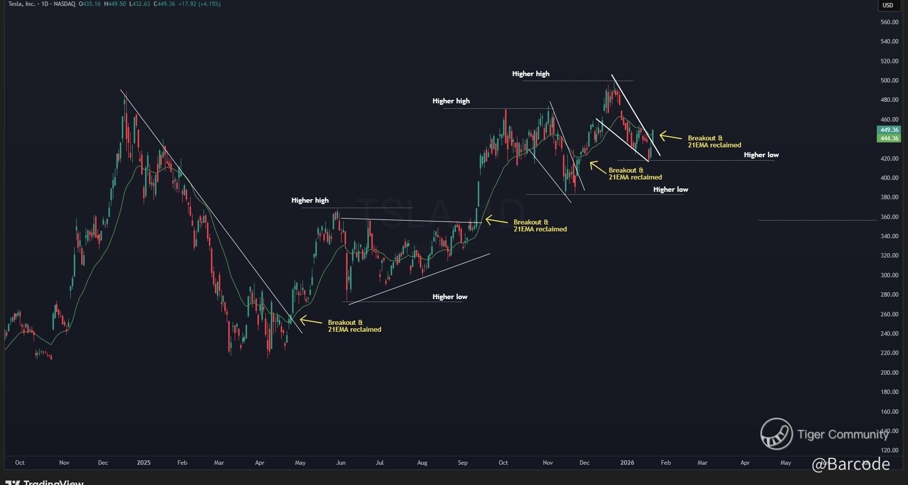 Price behaviour around these levels post-earnings will determine whether Tesla confirms continuation within its structural uptrend or extends consolidation within the broader accumulation base.