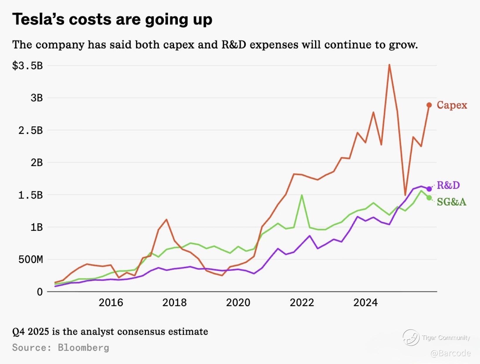 Capex, R&D, and SG&A remain structurally elevated, particularly Capex, as Tesla invests in: