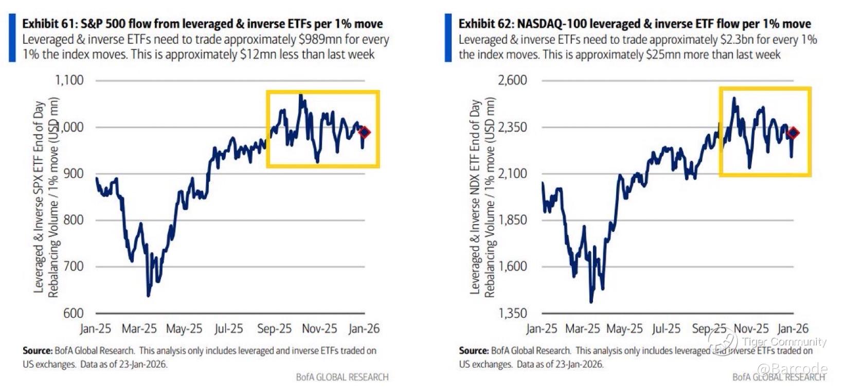 Both SPX and NDX leveraged ETF AUM were little changed, remain within recent ranges, and sit much closer to the highs of 2025 than the lows.