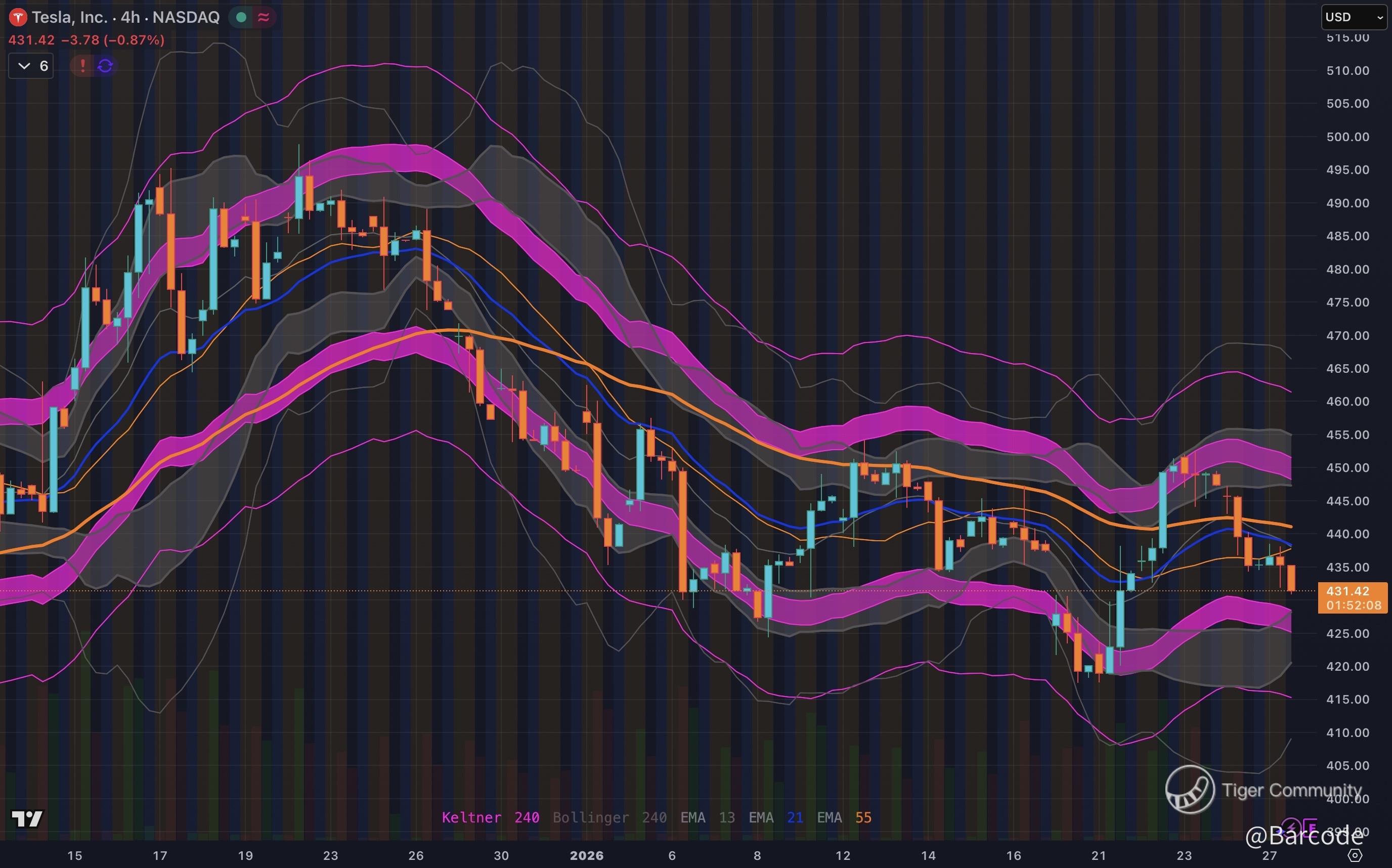 Keltner and Bollinger bands show volatility tightening and compression, creating a coiled volatility setup. With earnings approaching and dealer gamma dynamics in play, this increases the probability of a post-event volatility expansion rather than stagnation.