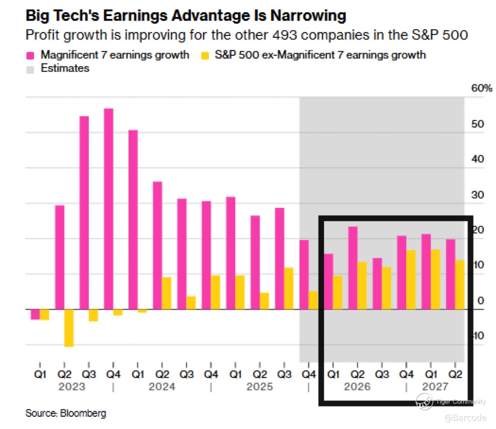 Quarter-by-quarter earnings growth expectations show Mag-7 dominance moderating, while earnings growth for the other 493 S&P 500 companies accelerates through Q2 2027.