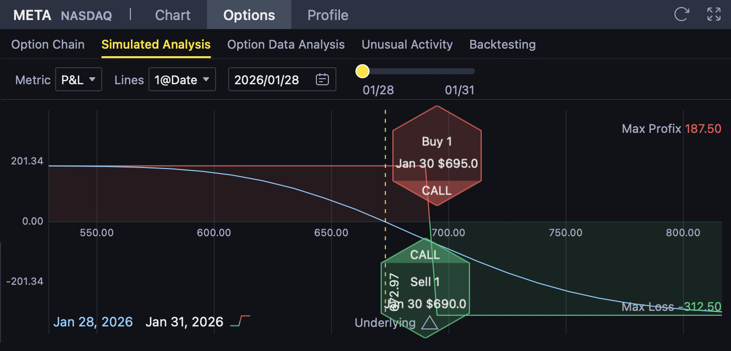 Investors inMETA Platforms, Inc. (META)Build aBear Call Spread Bear Call Spread。 The strategy passesSell lower strike price Call while buying higher strike price CallCompose of, belonging toLimited benefits, limited risksThe bearish or shock-bearish strategy is suitable for investors to judgeMETA stock isn't going to jumpSituation.