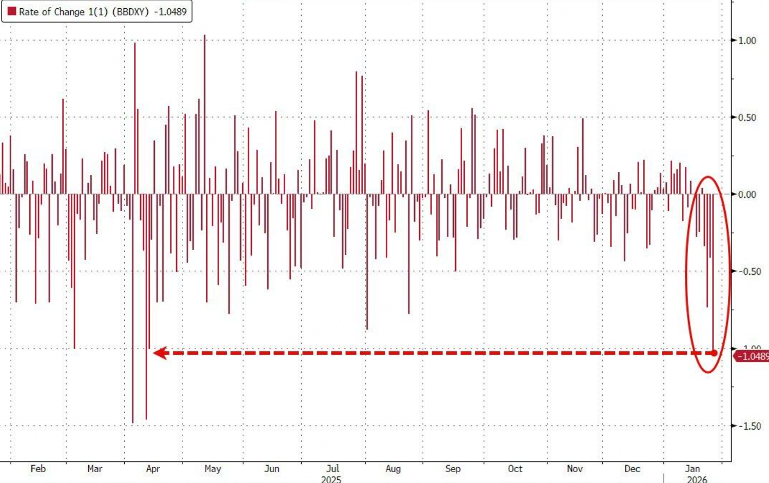 The Bloomberg Dollar Index dropped 1.2% in response, marking its biggest one-day decline since last year’s tariff-threat episode.