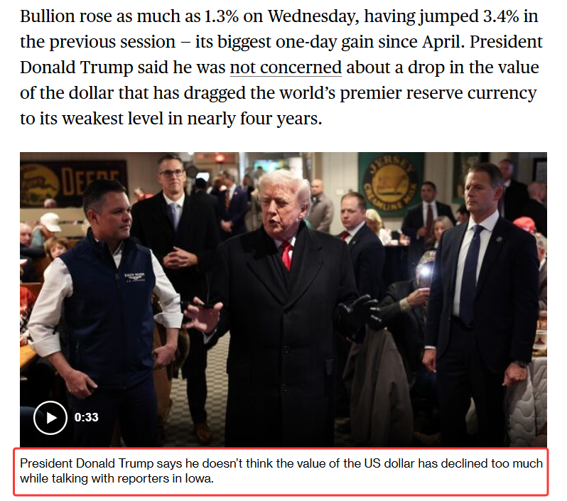 In market reporting, bullion rose as much as 1.3% on Wednesday after jumping 3.4% the day before (its biggest one-day gain since April), and Trump said he was not concerned about a weaker dollar even as the world’s premier reserve currency slid to its weakest level in nearly four years.