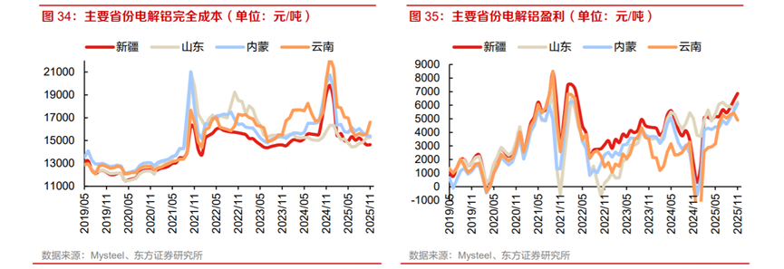 Grid investment rose 18% year-on-year; new energy vehicle production increased by 30%. This has driven higher demand for metals such as aluminum and copper. As shown in the chart below, electrolytic aluminum costs have declined, while profitability has steadily risen.