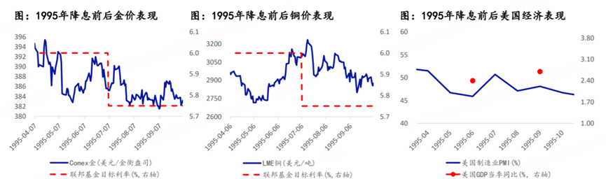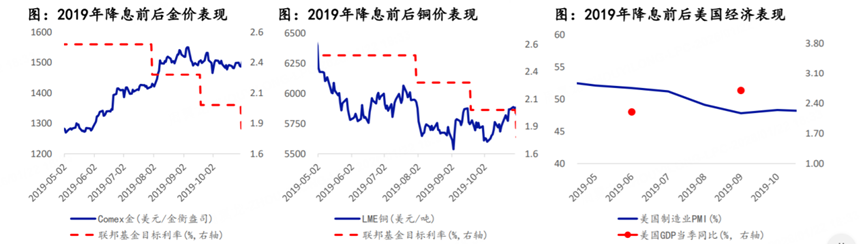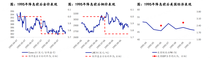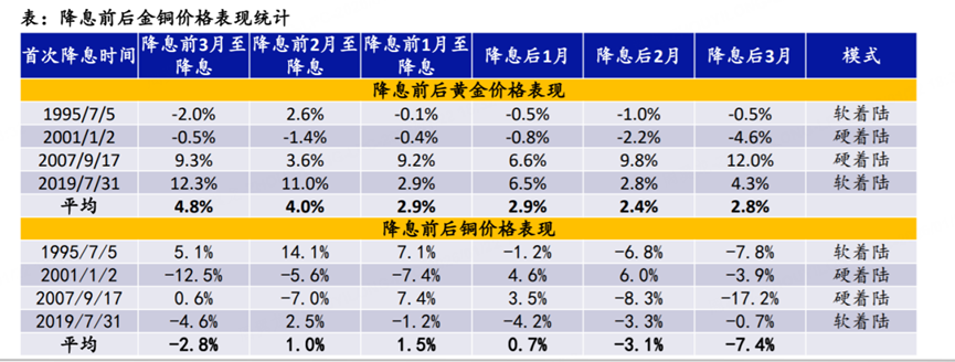 Take a look at the chart below—it shows how gold and copper performed around major Fed rate cuts in 1995, 2001, 2007, and 2019.