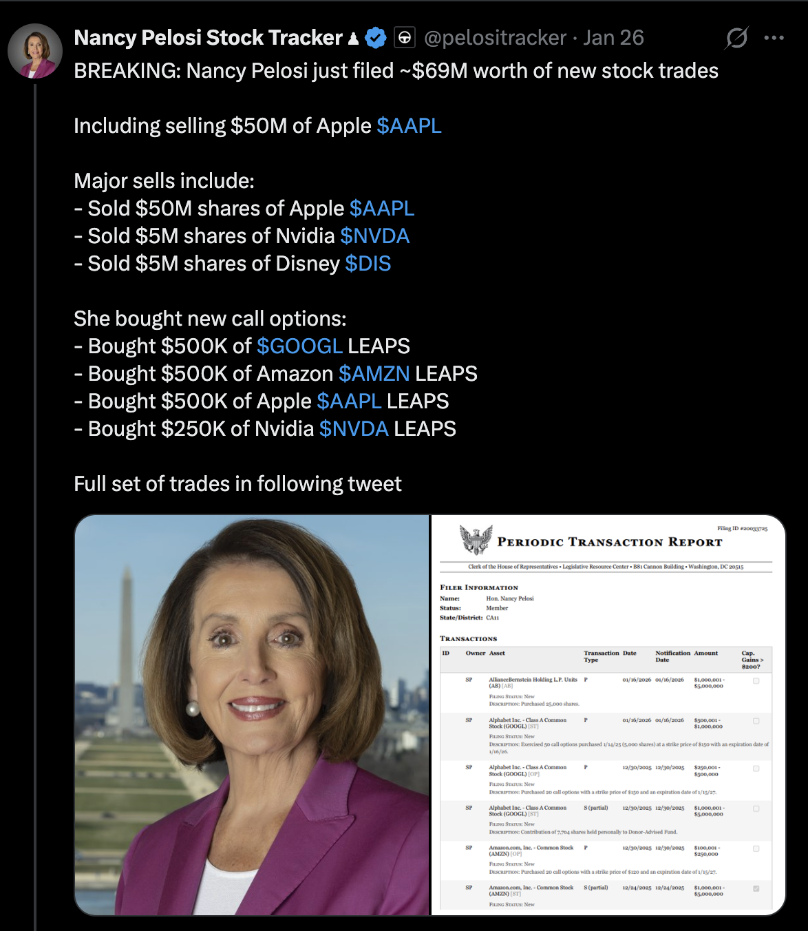 Nancy Pelosi reported roughly $69 million in recent transactions, highlighted by the sale of about $50 million worth of $Apple(AAPL)$, along with reductions in $NVIDIA(NVDA)$ and $Walt Disney(DIS)$