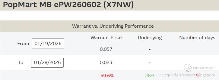 ✴Trending PopMart put warrant $PopMart MB ePW260602(X7NW.SI)$ (https://warrants.com.sg/tools/livematrix/X7NW) is down 59.6% to SGD 0.023 during this period.