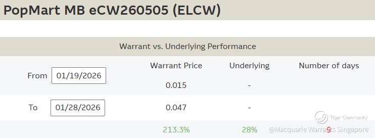 ✳During this period of PopMart's strong rebound, Macquarie's trending PopMart call warrant $PopMart MB eCW260505(ELCW.SI)$ (https://warrants.com.sg/tools/livematrix/ELCW) has spiked 213.3% to SGD 0.047, more than 7 times compared to PopMart's 28% gain based on the closing prices of the shares from 19 January to yesterday's close.
