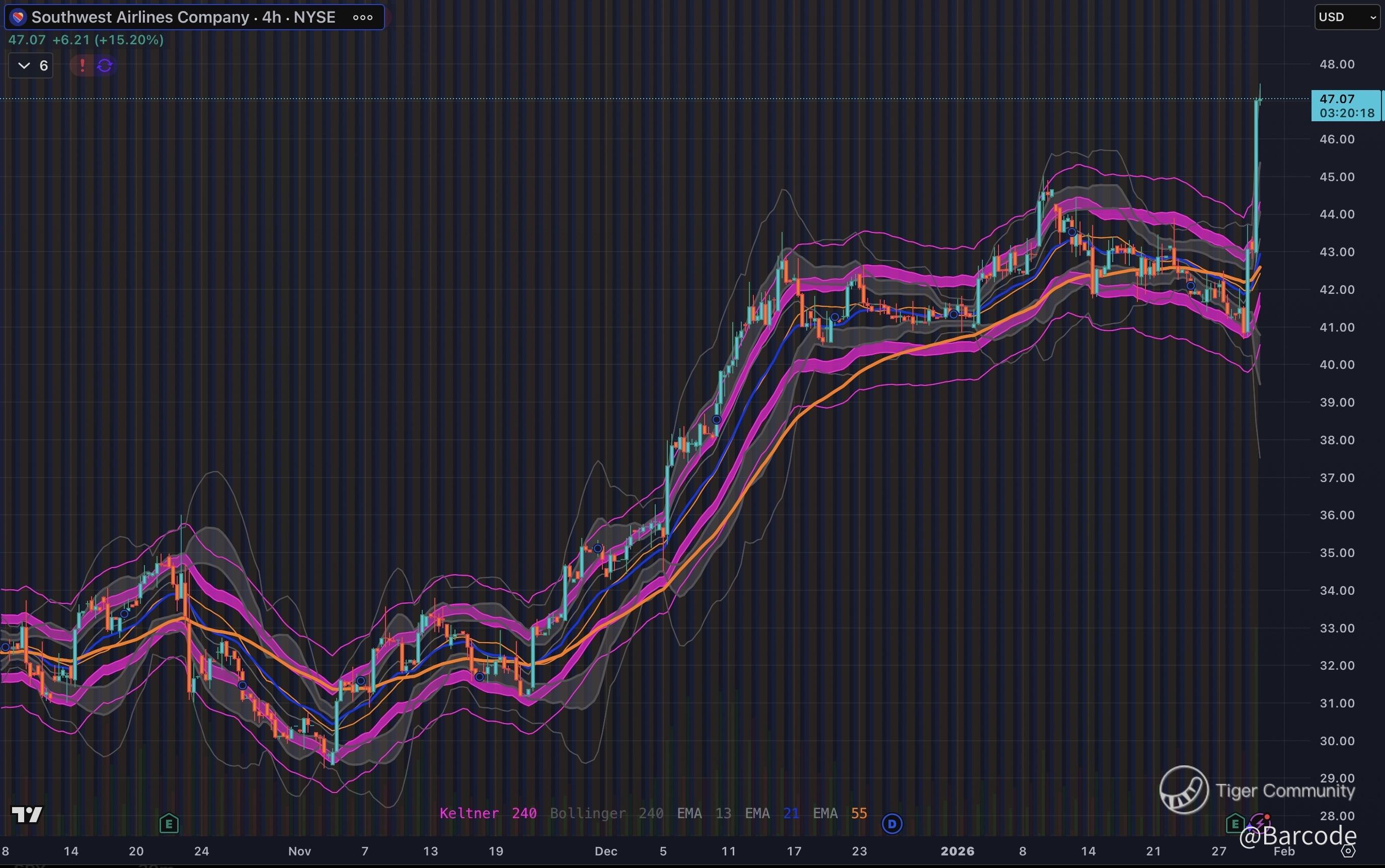 $Southwest Airlines(LUV)$ $United Airlines(UAL)$ $Delta Air Lines(DAL)$ โ๏ธโ๏ธ๐ Southwest $LUV erupts, earnings re-rating, liquidity rotation, breakout regime shift