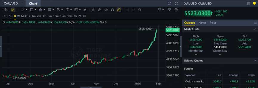 Yesterday’s move above $5,300 already reflected strong upside momentum, yet today gold showed no signs of exhaustion, surging in one straight move to nearly $5,600. Behind this explosive rally lies a more volatile global geopolitical environment.