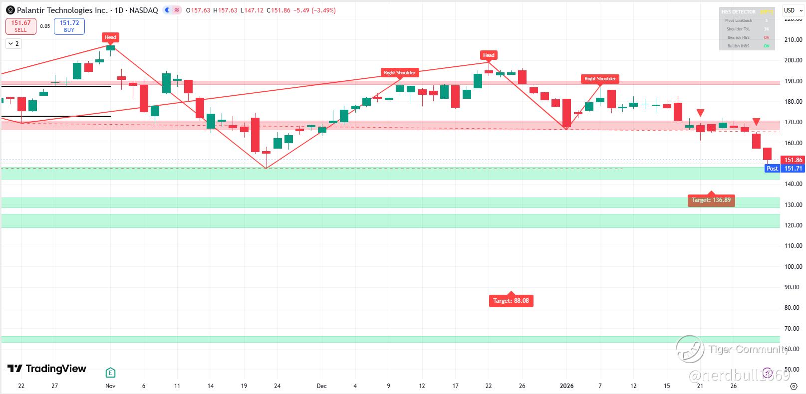 Bearish Signals: A Head & Shoulders pattern is forming. The "Neckline" support at $160–$162 was recently breached, with the stock closing near $151.86 on Jan 29.