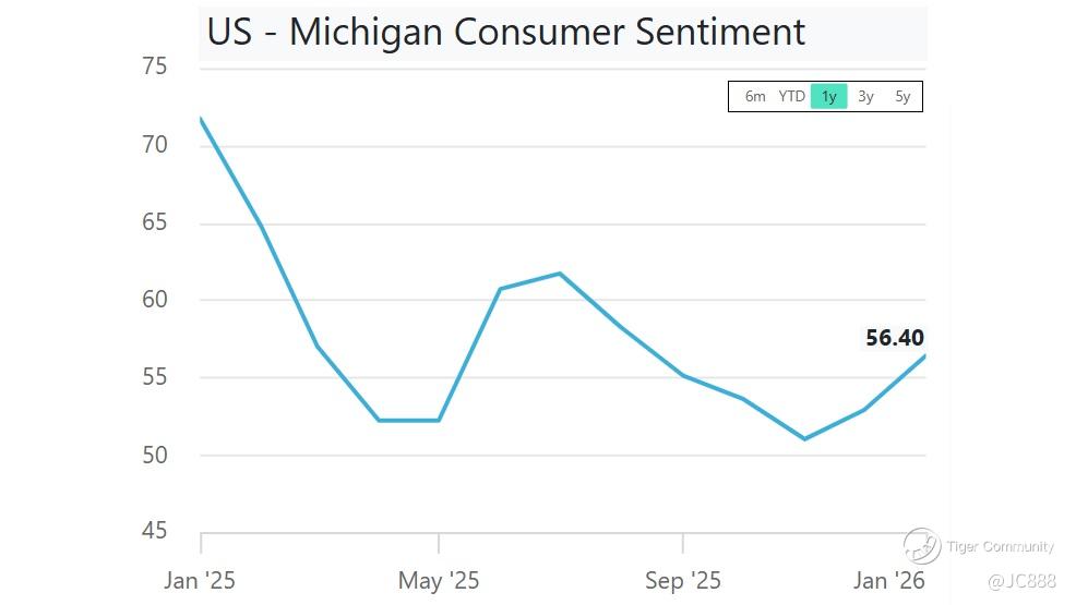 The final US consumer sentiment index for January 2026, was revised sharply higher to 56.4 from the preliminary 54.0 and December’s 52.9.